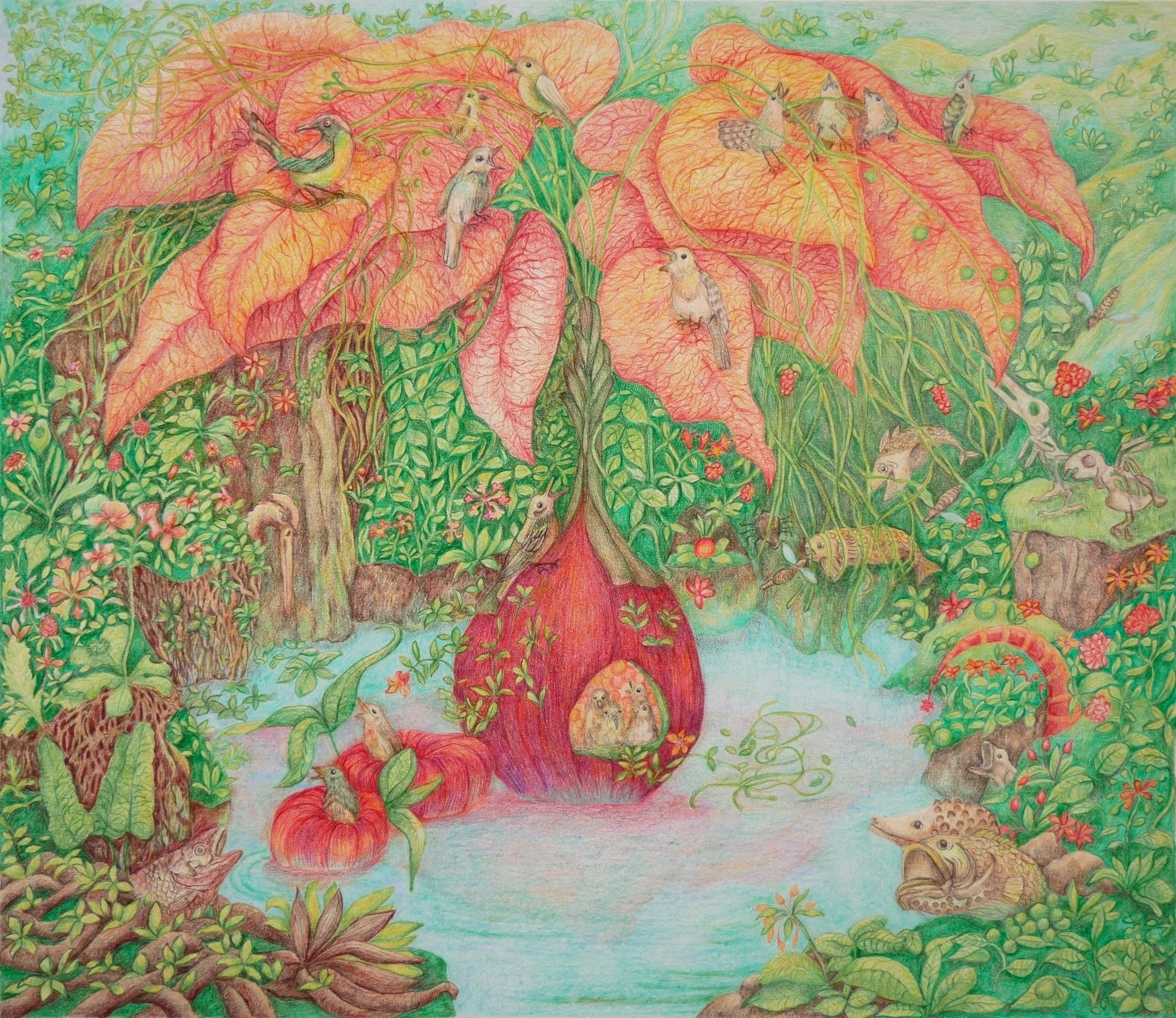 Owoce korzeni, kredka na papierze, 35,5x29,5 cm
