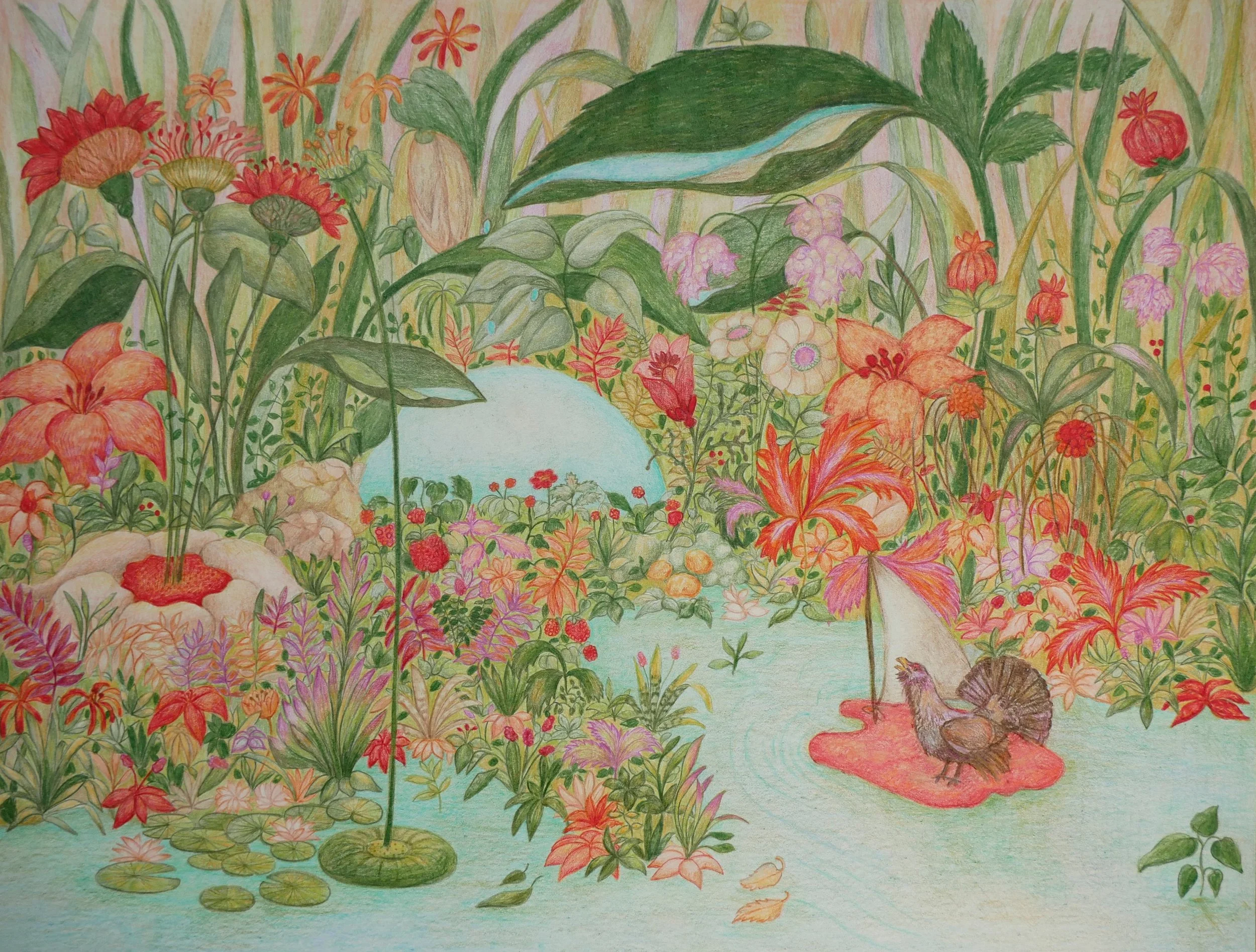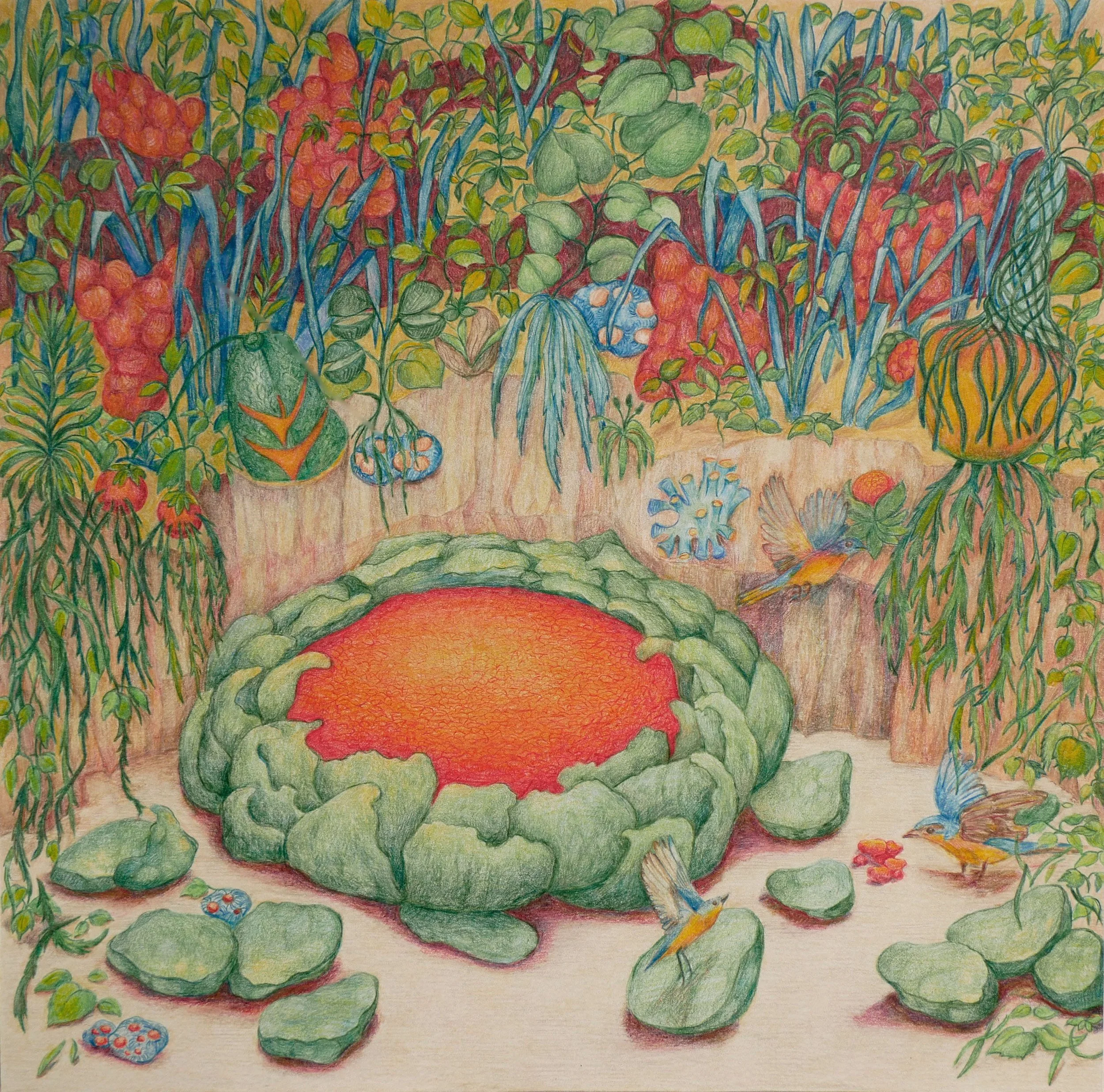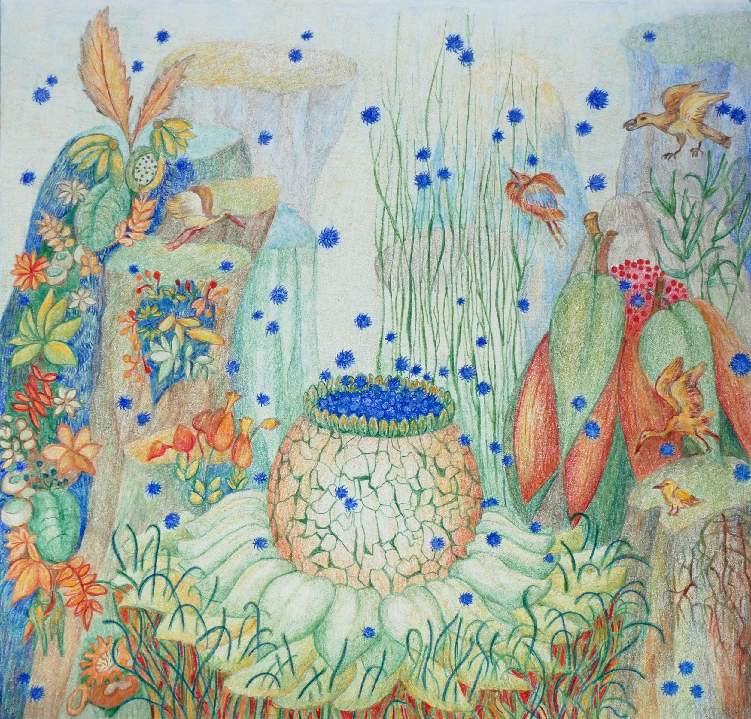 Ognisko ciszy, kredka na papierze, 30 x 30 cm